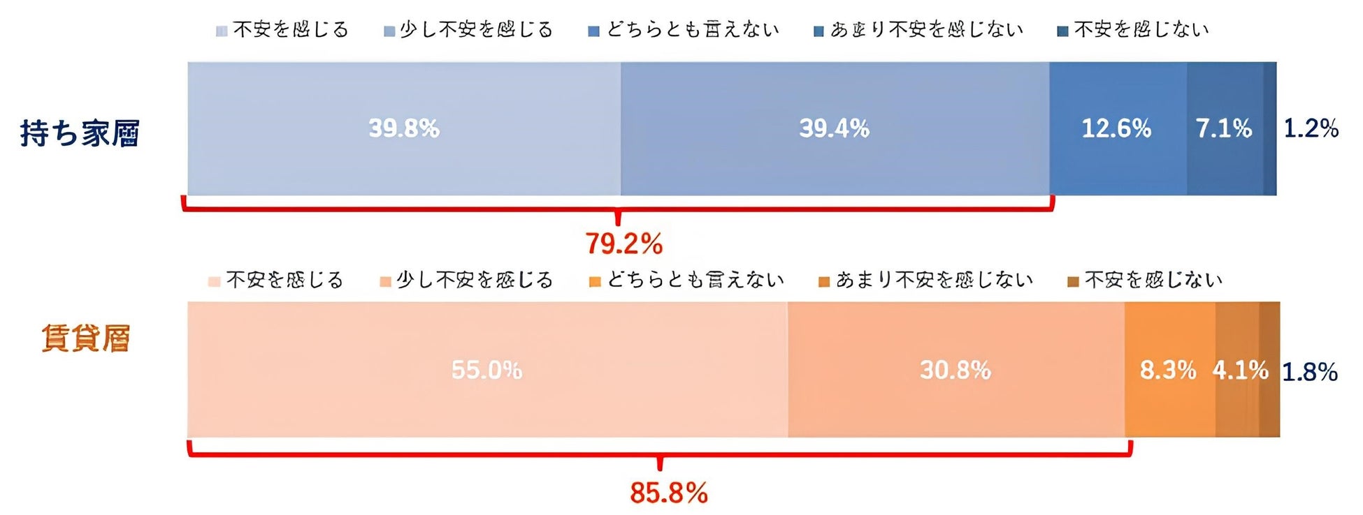 ■持ち家層の79.2%、賃貸層の85.8%が老後に不安を感じている