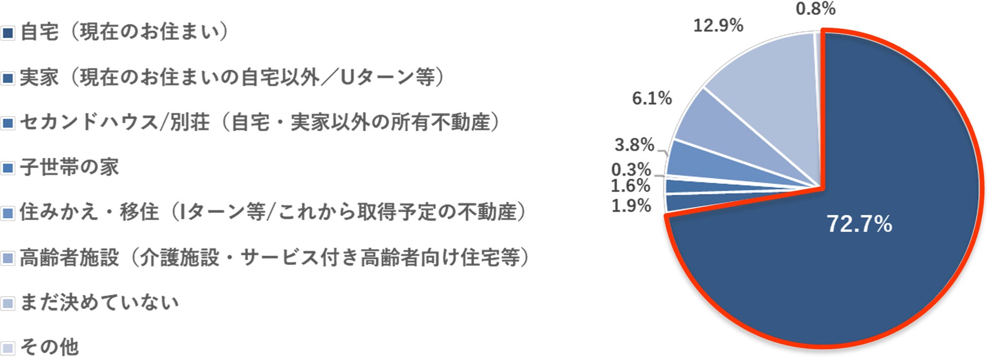 また、「老後、どこに住もう(生活しよう)とお考えですか」と聞いたところ、持ち家層の72.7%が自宅(現在の住まい)と回答。多くの方が、老後の住まいに関しては現在のご自宅での生活を望んでおられることが見て取れます。