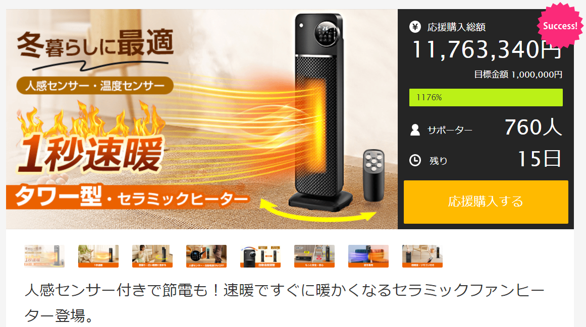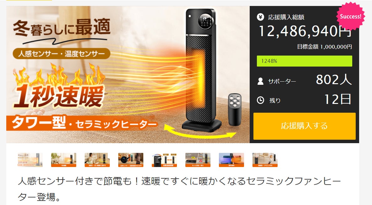 【1秒・効率暖房】速暖ですぐに暖かくなるオリジナルタワーヒーター登場。人感センサー付きで節電も!Makuakeで目標金額1200%超!