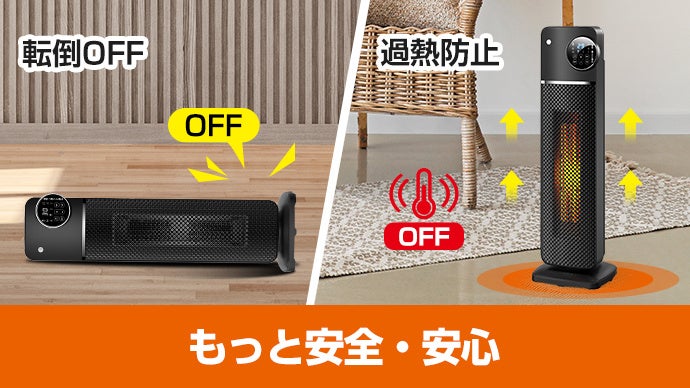 転倒オフスイッチを内蔵しており、安全面も心配なく、トラブルも防止します。そして温度の過上昇を防ぐ安全装置について、サ一モスタッ卜&温度ヒュ一ズ2種類の温度調整装置を搭載して、温度の上がり過ぎを防止します。