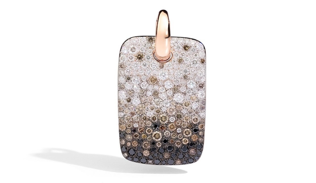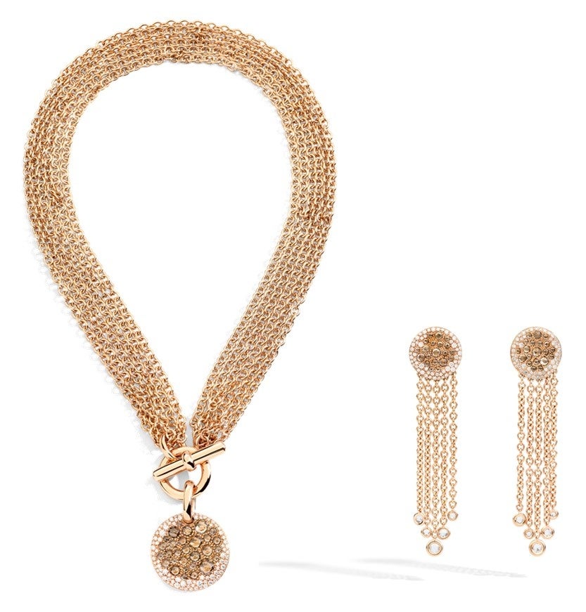 コレクションの主役は、プレシャスな宝石でさえも大胆に取り入れるポメラートのスタイルを体現するネックレスです。その価値の高さと卓越した職人技術にもかかわらず、ホワイトとブラウンのダイヤモンドをあしらったペンダントとTバークラスプを用いた6つのチェーンを束ねたネックレスは、昼夜を問わず身につけやすくデザインされています。この滑らかな着け心地のネックレスは、スライド式のペンダントにより2重にしたり、ロングネックレスとしてもまとうことが可能です。