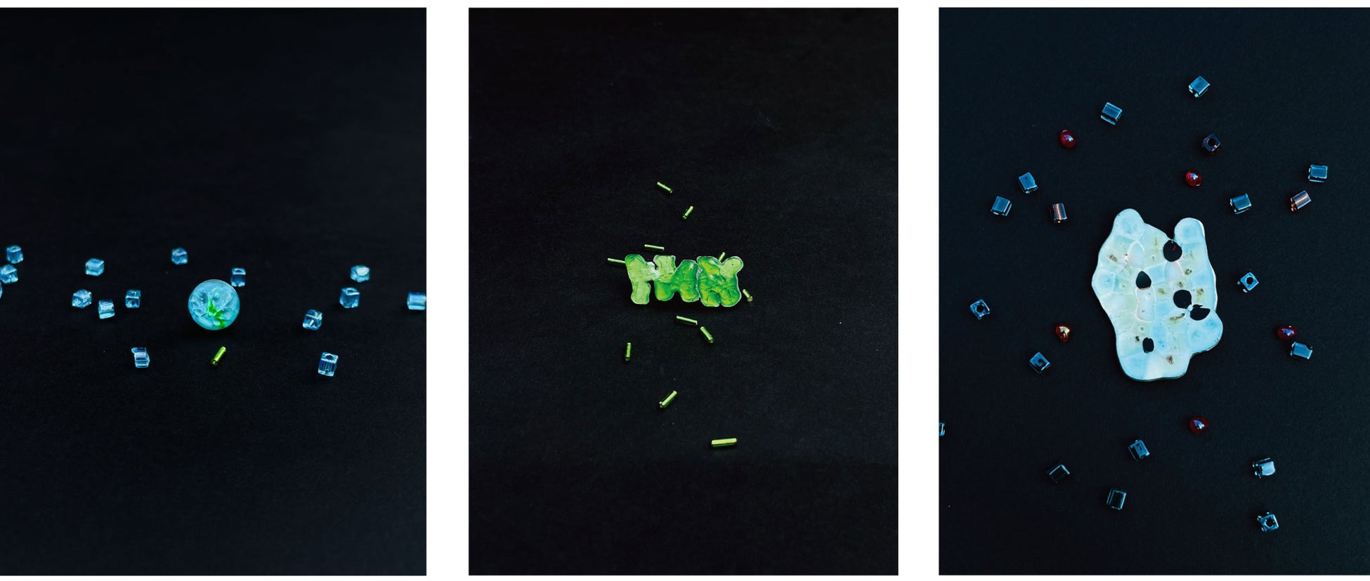 デザイン説明:リサイクルビーズをシルバーの上に溶かし、ビーズの自然な形そのままを生かしました