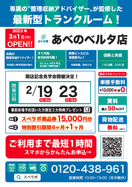 【あべのベルタ店/3月1日(水)オープン】見学から契約、解約まで完全非接触・非対面、お申し込みからご利用まで最短1時間!都内、大阪などにて絶賛運営中のトランクルーム【スペラボ】が阿倍野駅近くに出店!