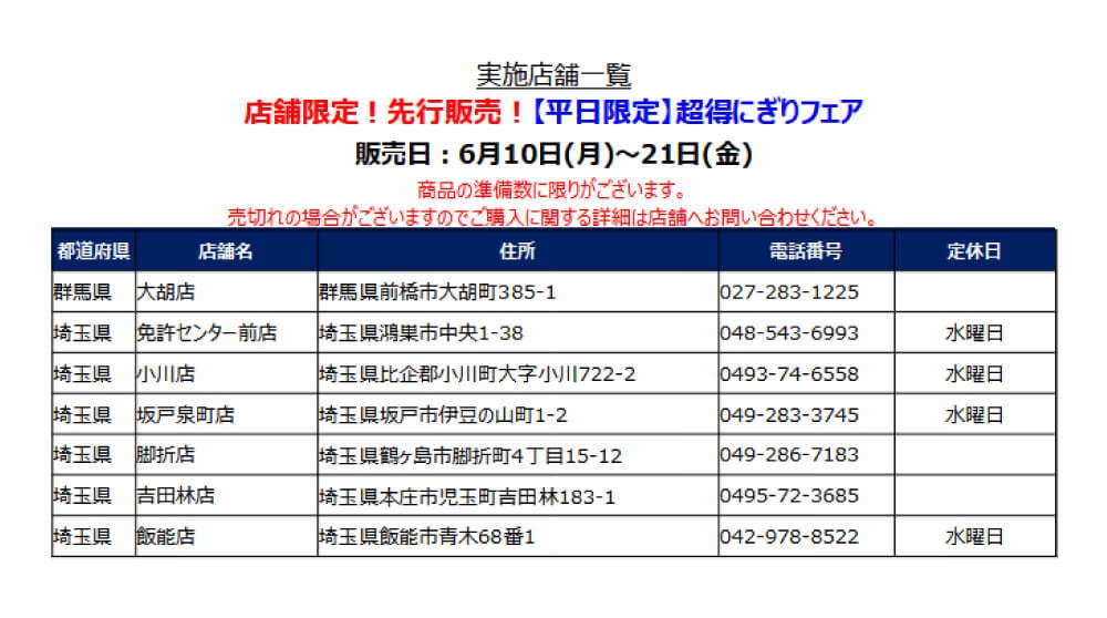※小僧寿し 大胡店・吉田林店・飯能店・免許センター前店・小川店・脚折店・坂戸泉町店 限定開催!