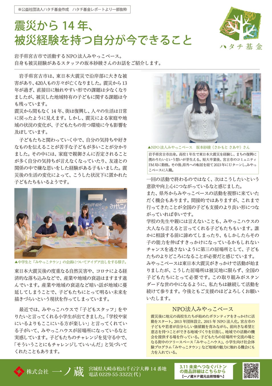 また、ハタチ基金の支援を受けた宮城県の大学生が、令和6年能登半島地震被災地で、子どもの居場所づくりに関わるという「ご恩送り」につながっている。子どもの将来を見据え、共感と希望を生み出す覚悟ある取り組みを高く評価したい。