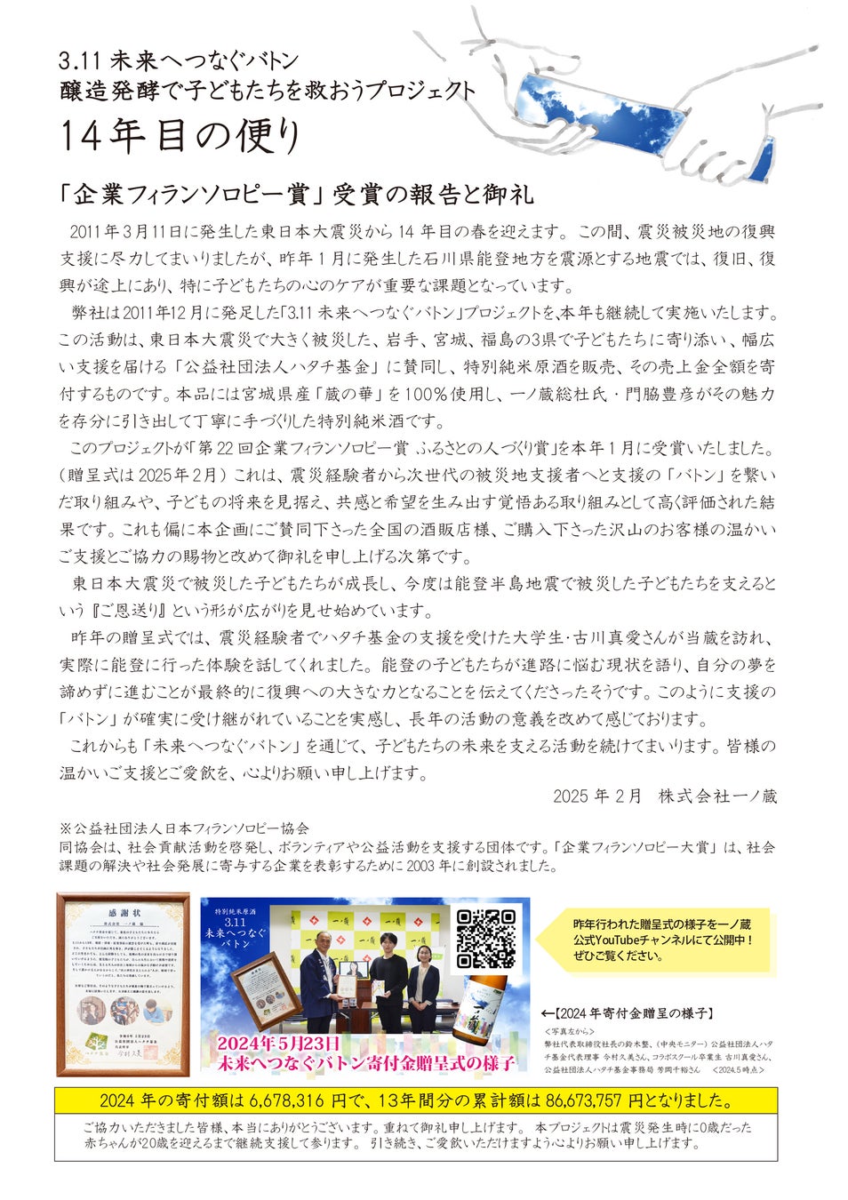 ふるさとを思い自然との共生を事業の核に据えた酒造りを営む同社は、2011年の東日本大震災時、「沿岸部の子どもたちは勉強どころではない」との社員の一言を契機に全社員で被災地を視察。子どもたちに学ぶ機会と場所を提供したいという思いから、支援活動を検討。2011年当時0歳だった子どもが20歳を迎える2031年までバトンをつなぎ続けるとの決意のもと、宮城県産米を使用した原酒『3.11未来へつなぐバトン』を製造・販売し、売上全額を公益社団法人ハタチ基金に寄付する取り組みを同年12月に立ち上げた。2023年度までの寄付額は累計約8,000万円にのぼる。