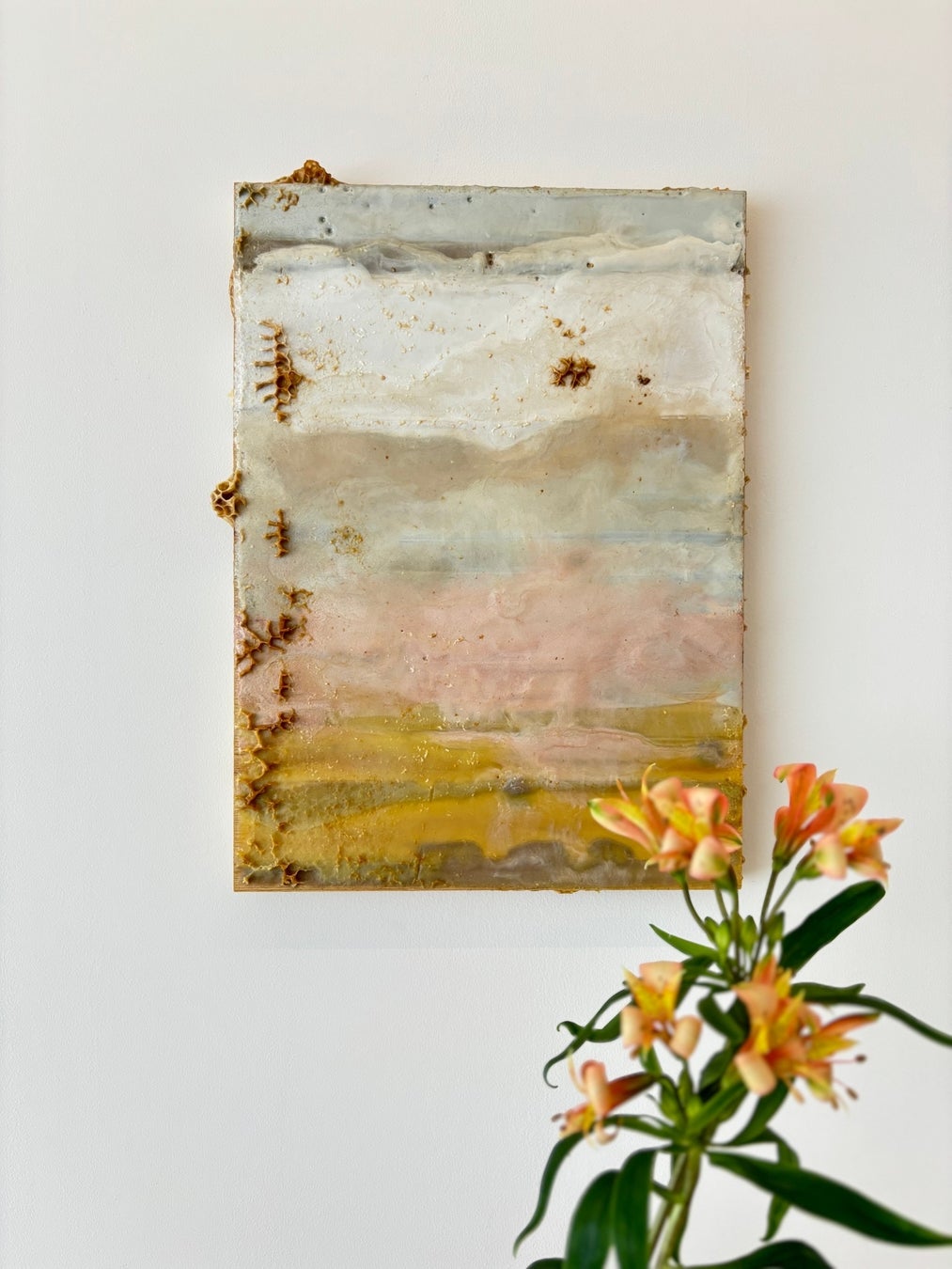 團上は、絵画、立体、詩、ソーシャルプロジェクトなど、多領域にわたる表現を展開している。「この星を救う絵画」としたシリーズでは、蜂の巣を素材に、蜜蜂と人類の古代からの関係を主題とする作品を制作している。自然と宇宙生命、歴史と霊性の交錯する表現を通じて、私たちの生と環境の再接続と治癒を探る。