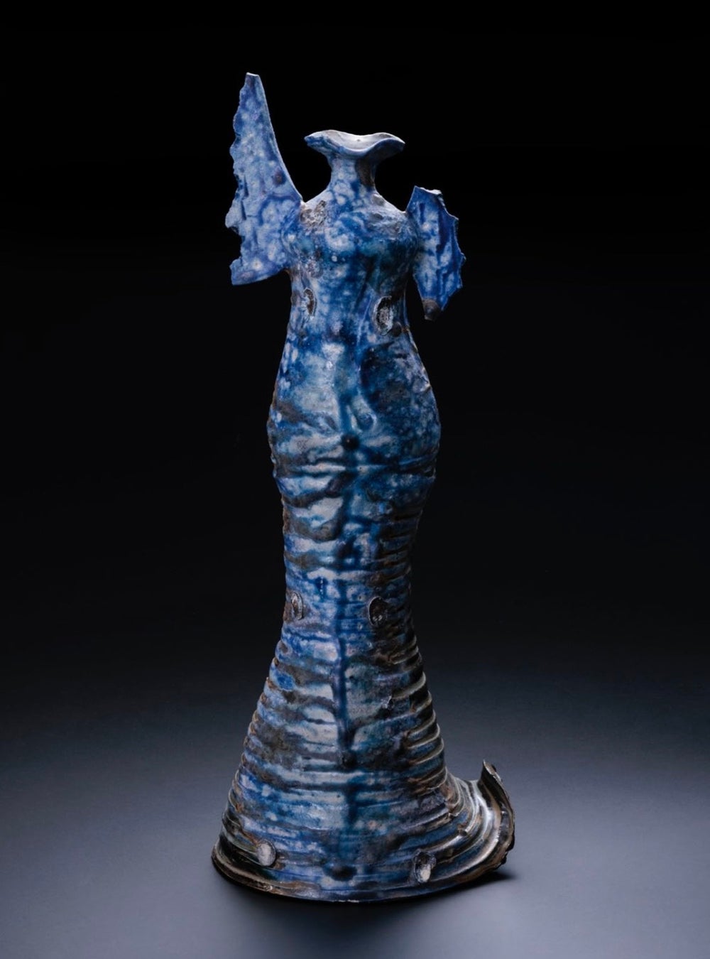 代表作である「Torso」は人体をモチーフにした花器で、花を生けると花が顔となり作品は完成する。釉薬を使わず、土の調合と窯焚きで土から湧き出る様にして発色する蒼は一つとして同じ景色は生まれない。一眼見て私の作品だと分かる備前焼を作りたい。私の作品制作は使う事が出来るオブジェを作っている感覚です。