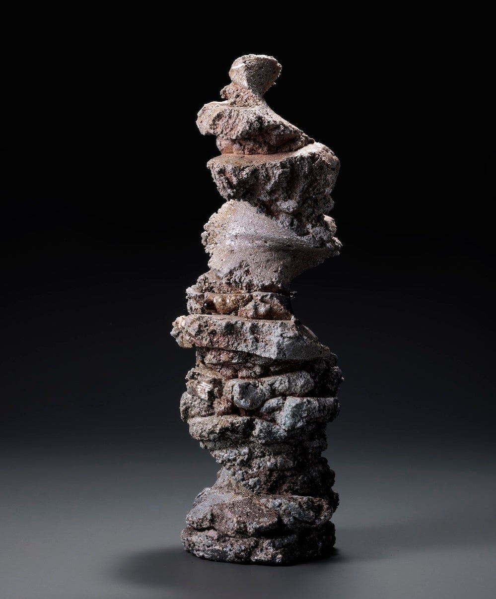 周知の通り、土は単一な素材ではない。岩石や小石、細かな砂、泥、火山灰、動植物の死がいなどが重なり合い、層となり、大地として足元を固める。様々な成分が関わって複雑な表情を見せる備前土は、ただ、掘り出しただけで美しい。その姿をありのまま表現するため、手作業で小石や不純物を取り除き、菊練りをせず、全て手びねりで成形した作品「地層」シリーズや、備前市三石地区の地下156mから採掘された濁りのない陶石のみを薪窯で無釉で焼き締めた「白備前」シリーズなど、どの作品も土への尽きない興味を原動力に生み出している。