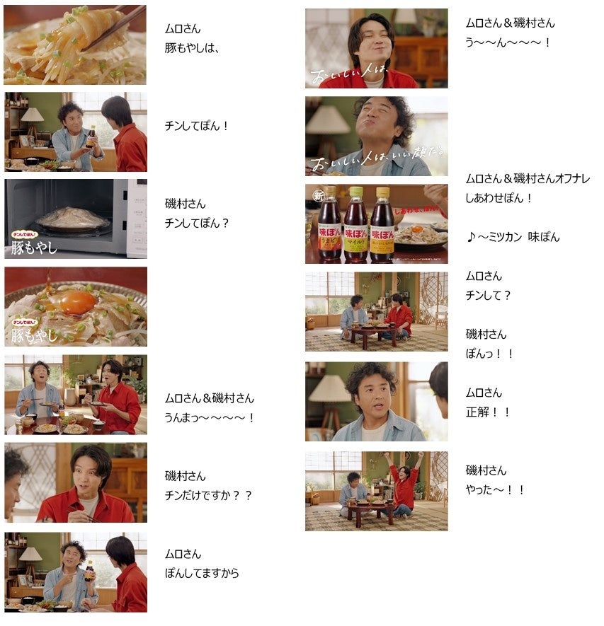 今春からスタートした新コミュニケーションでは、気の置けない仲間が集うムロツヨシさんの部屋を舞台に、ムロさん自ら「味ぽん」を使った絶品メニューと楽しいおしゃべりで来客をもてなし、食卓を囲むしあわせなひと時を描いたCMシリーズを展開。最新作の第2弾では磯村勇斗さんをゲストに迎え、言葉遊びを楽しむ中で、おいしい「豚もやし」が手軽に作れることを伝える『チンしてぽん!』篇をはじめ、豚肉ともやしの相性についてムロさんがうんちくを傾けるも、おいしさの余り、自分の世界に浸る磯村さんに戸惑う『力説』篇、ムロさん自慢の「ぽん餃子(=味ぽんで食べる餃子)」を食べた瞬間、二人のリアクションが被ってしまう『ジュワジュワ』篇の3篇を制作しました。お互いの相性を「100点満点(ムロさん)」「120点(磯村さん)」と評した二人が、味ぽんを使った「ぽん餃子」や「豚もやし」のおいしさと手軽さを、それぞれ独特の表現でコミカルにアピールしていく、和気あいあいとした掛け合いにご注目ください。