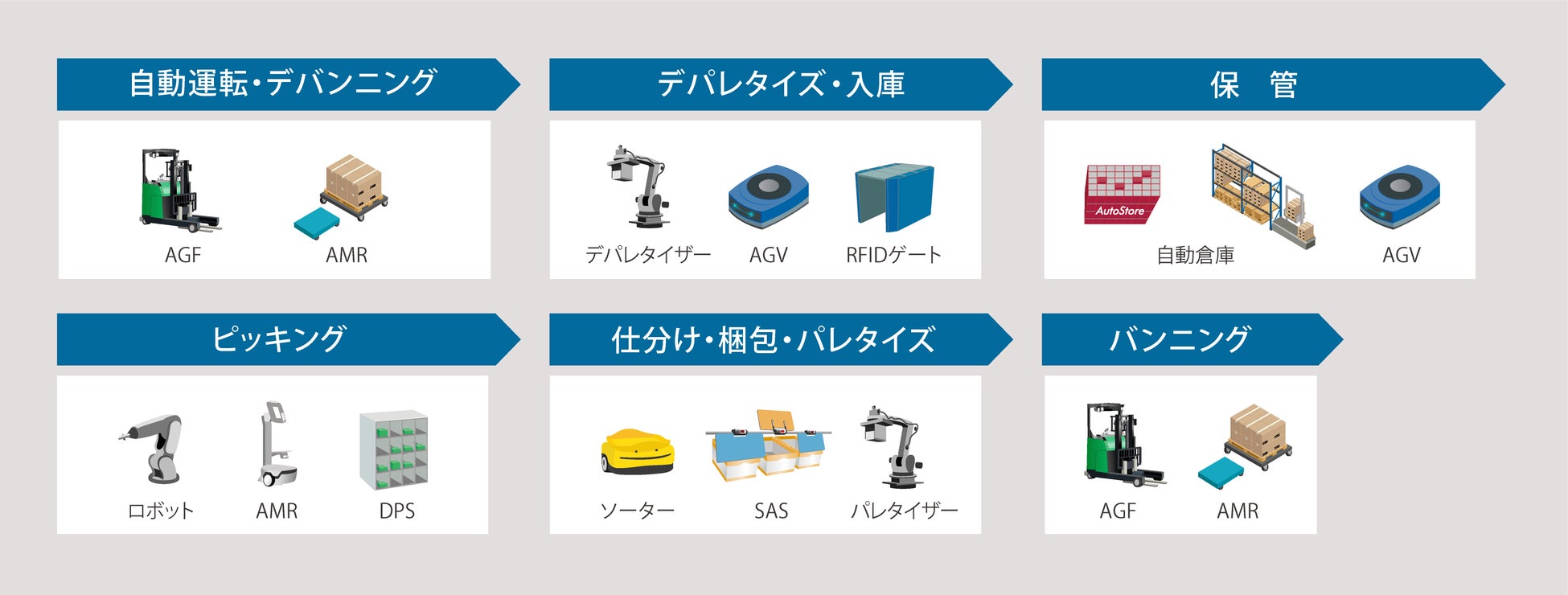 そしてこの度、今後の倉庫自動化の本格化に向け、2025年度にプラグイン強化を一気に進める決定をいたしました。第一弾として主に倉庫自動化の入口として検討される搬送、保管、仕分け工程で用いられる6機種を2025年度中に追加し、下記12機種に対応することとしました。