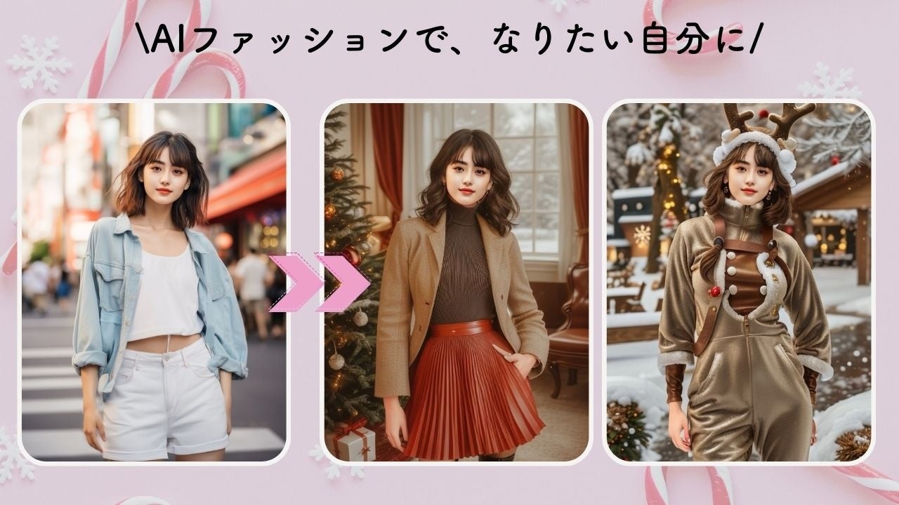 華やかなドレススタイルやクリスマスコスチュームなど、AIが提案するトレンドファッションで、いつものあなたをもっと素敵にドレスアップ。