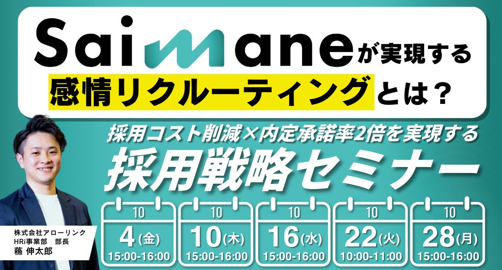 タイトル:採用コスト削減×内定承諾率2倍を実現する採用戦略セミナー ~Saimaneで実現する感情リクルーティングとは?~