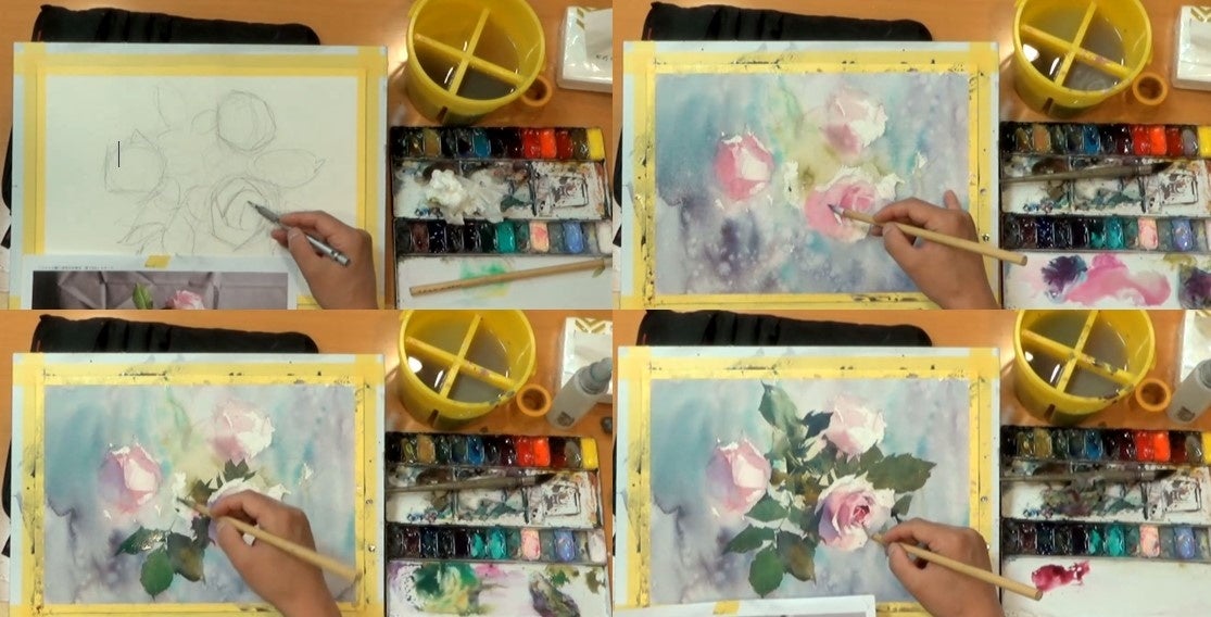 第1期講座は昨年9月から11月にかけて開催。テーマ「花」の回では、バラの写真を見ながら描くデモンストレーションと解説を通して、光と影、明暗のコントラストを意識した花の描き方をレクチャーしました。ほかの参加者や物に視界を遮られることなく、デモンストレーションをじっくりゆっくり視聴できるのは、オンライン開催ならではのメリット。