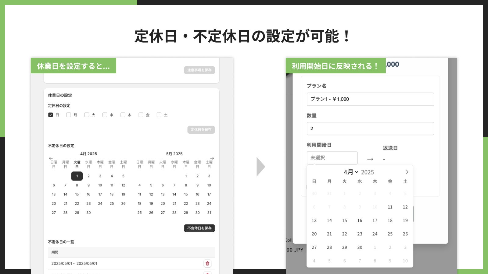 店舗や倉庫の休業日を事前に登録できるため、レンタルや返却を受け付けない日をシステム側で自動的に除外できます。