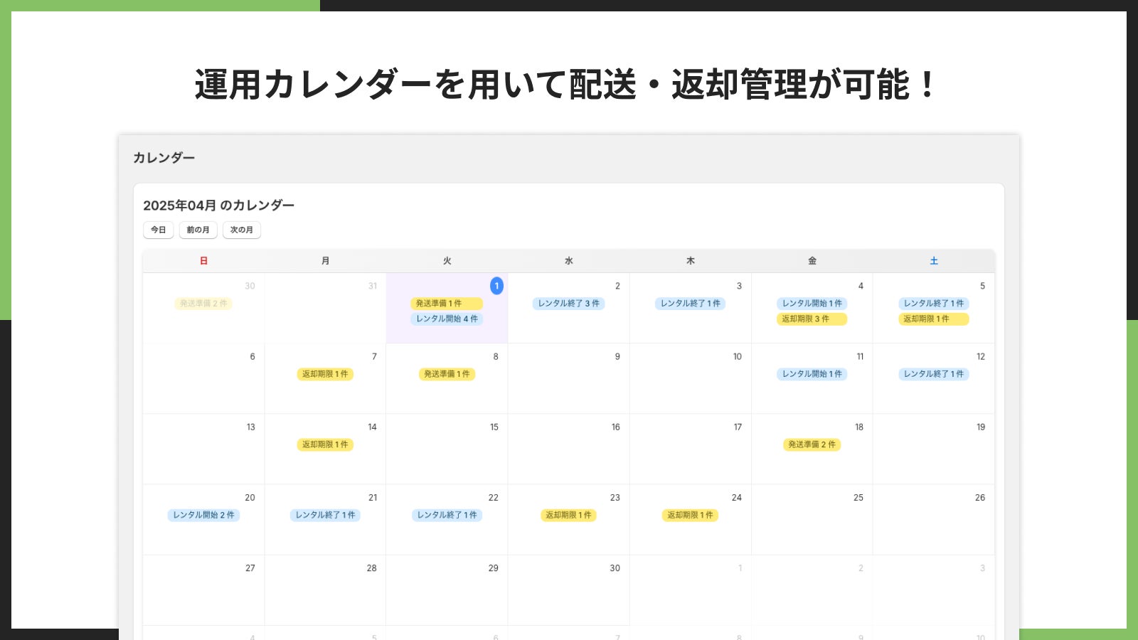 レンタル商品の配送・返却スケジュールをひと目で把握できる「運用カレンダー」機能を搭載。