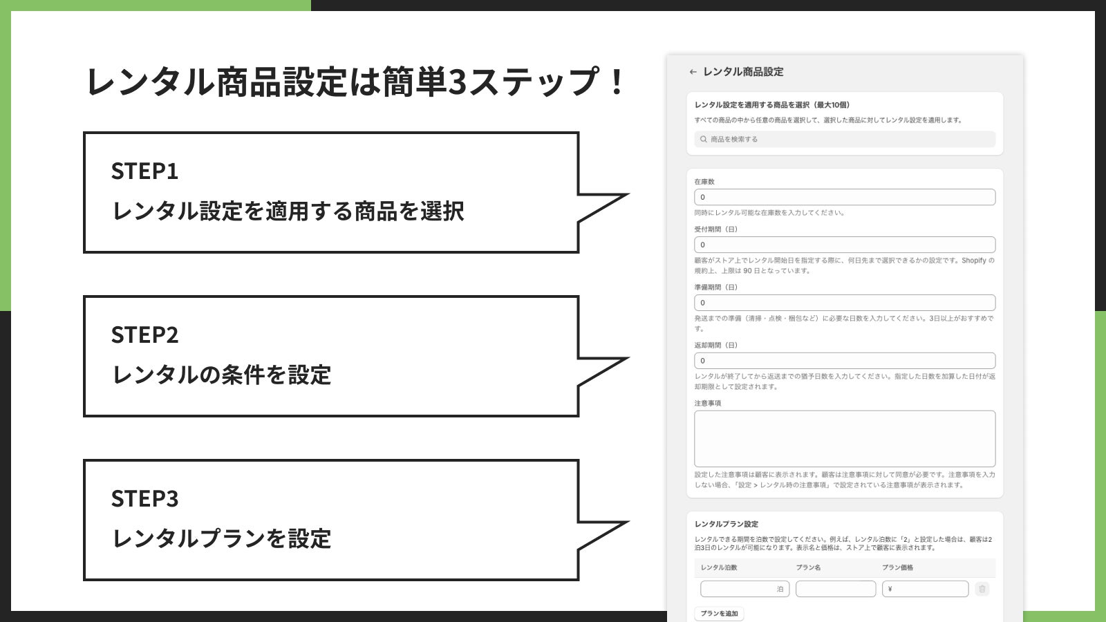 商品ページ上で、ユーザーが「いつから」「何個」「どのプランで」レンタルするかをその場で選べるため、オンラインでの予約がスムーズに完結します。
