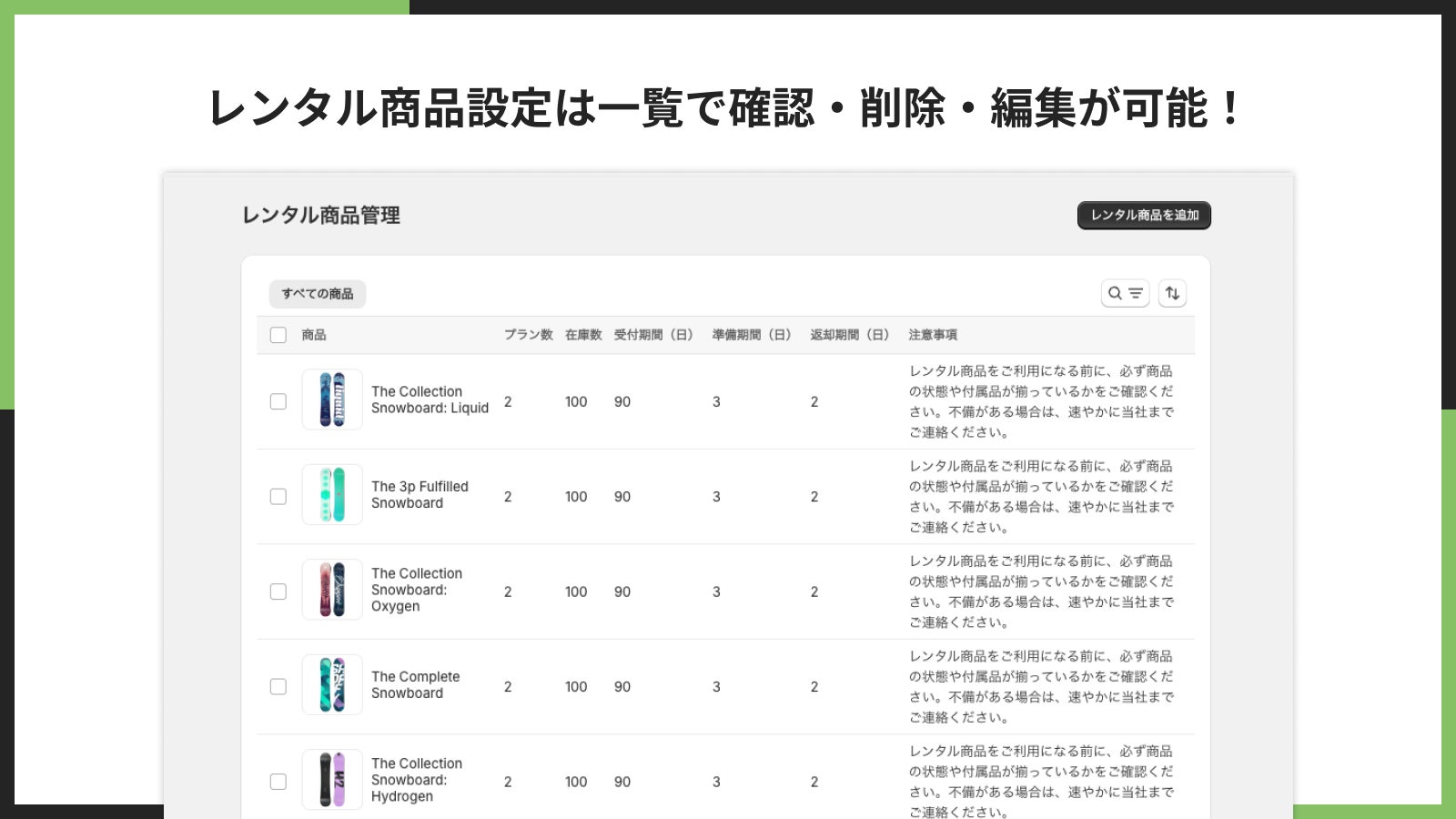 登録されたレンタル商品の内容は、一覧形式でわかりやすく表示されます。