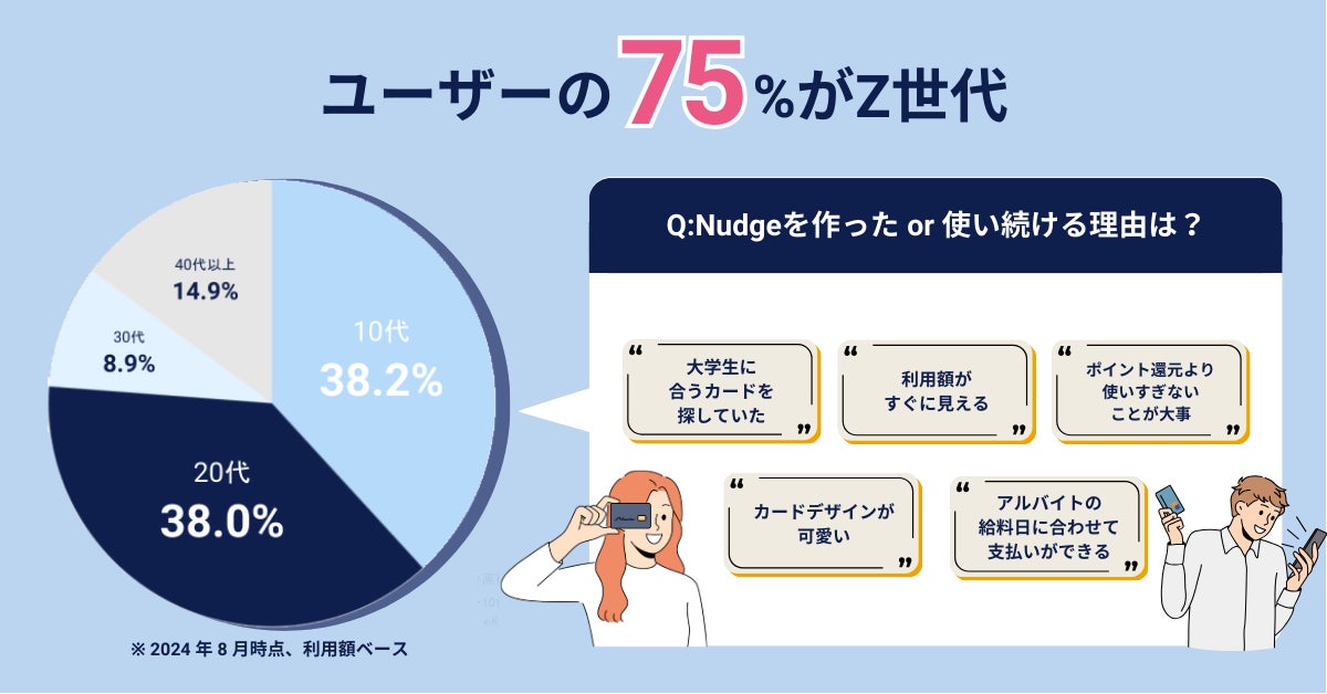 Nudgeは、「いつでも好きなだけ返済」機能に加え、100種類を超えるカード券面デザインや多様な提携先との特典設定により、ユーザーの75%を10−20代が占めております。