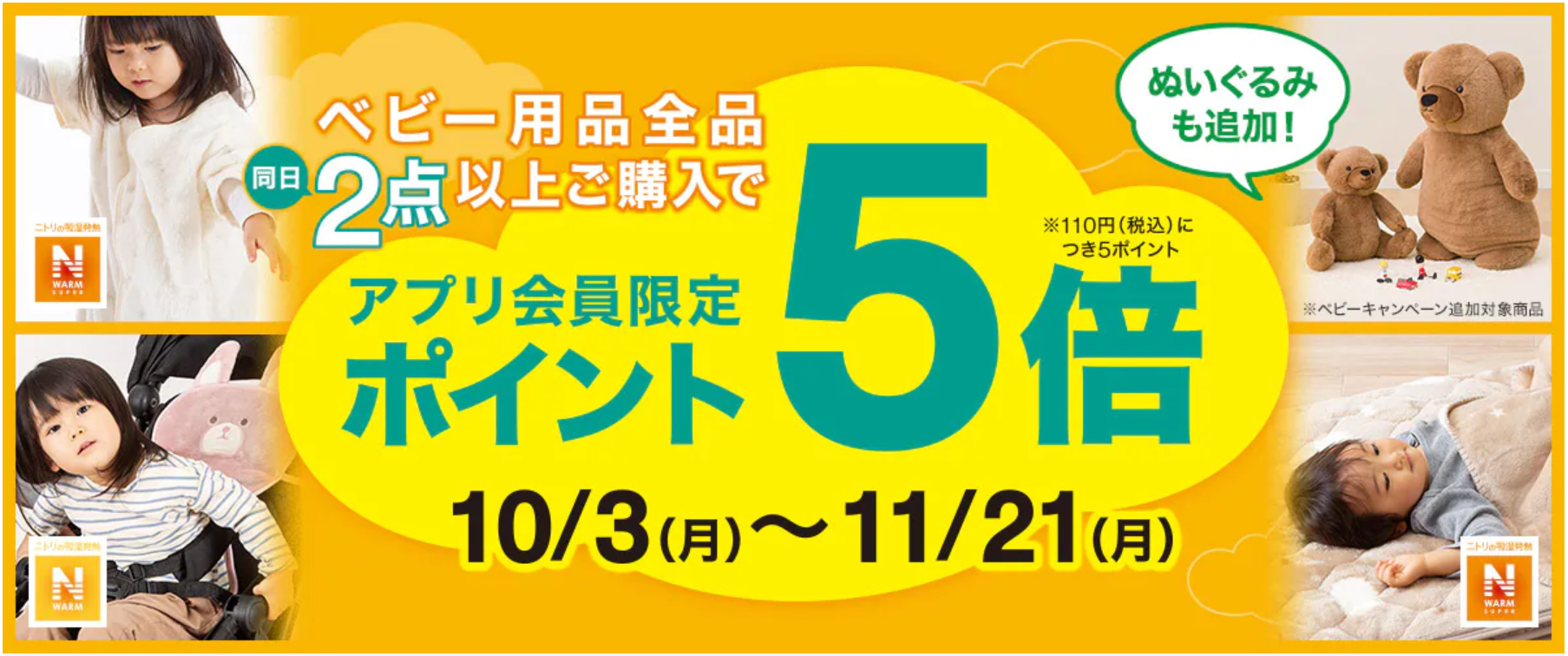 10/3(月)~11/14(月)までの期間中、ベビー用品 & ぬいぐるみ を対象商品とし、同日に2点以上ご購入で、アプリ会員限定ポイントが通常の5倍付与(※110円(税込)につき5ポイント)となるお得なキャンペーンです。今回は大人気のニトリオリジナルぬいぐるみもキャンペーン対象に加えました。ニトリアプリ会員のお客様限定の特典となりますので、この機会にニトリアプリにご入会ください。