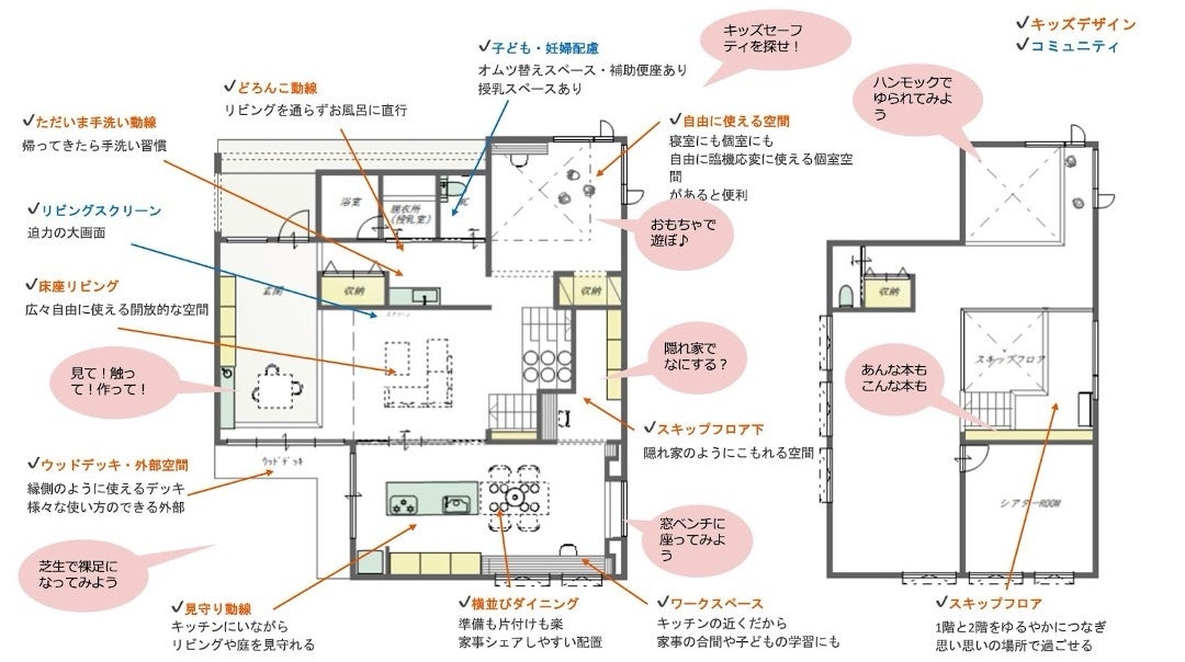 アイフルホームの家づくりのスタイルである「キッズデザイン」を数多く導入しています。特に2Fでは、このキッズデザインを、親子の成長物語を通して表現しています。
