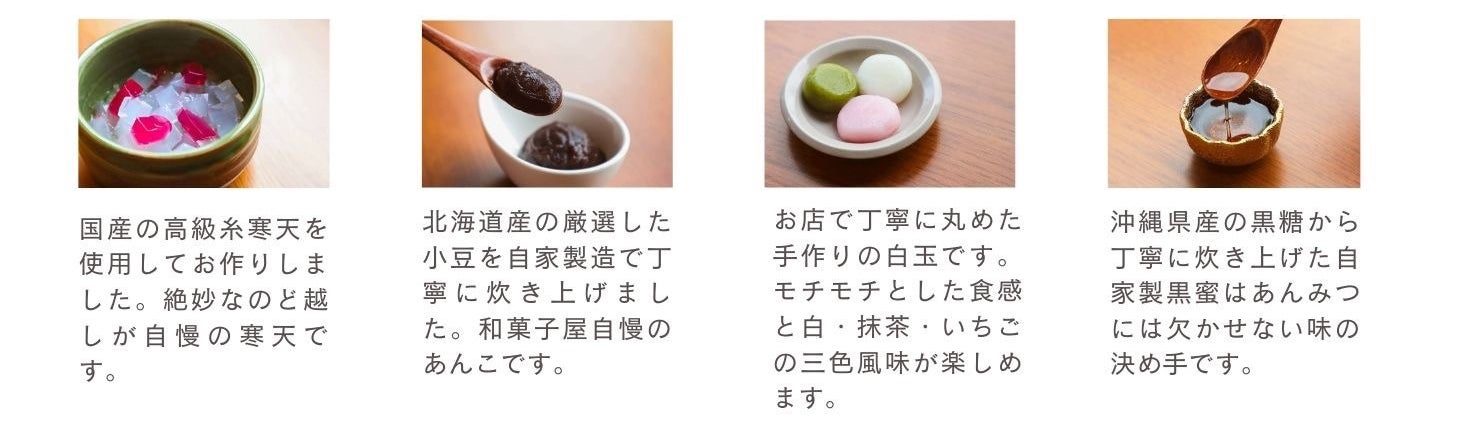 黒蜜|沖縄県産の黒糖を時間をかけて煮詰めた、濃厚で上品な甘み 寒天|京都の高級糸寒天を丁寧に煮溶かし、口の中でとろけるような喉ごし あんこ|北海道・十勝の契約農家から届く小豆を、自社独自製法で炊き上げた極上粒あん 白玉|店内仕込みのモチモチ食感。白・抹茶・いちごの三色白玉で華やかに