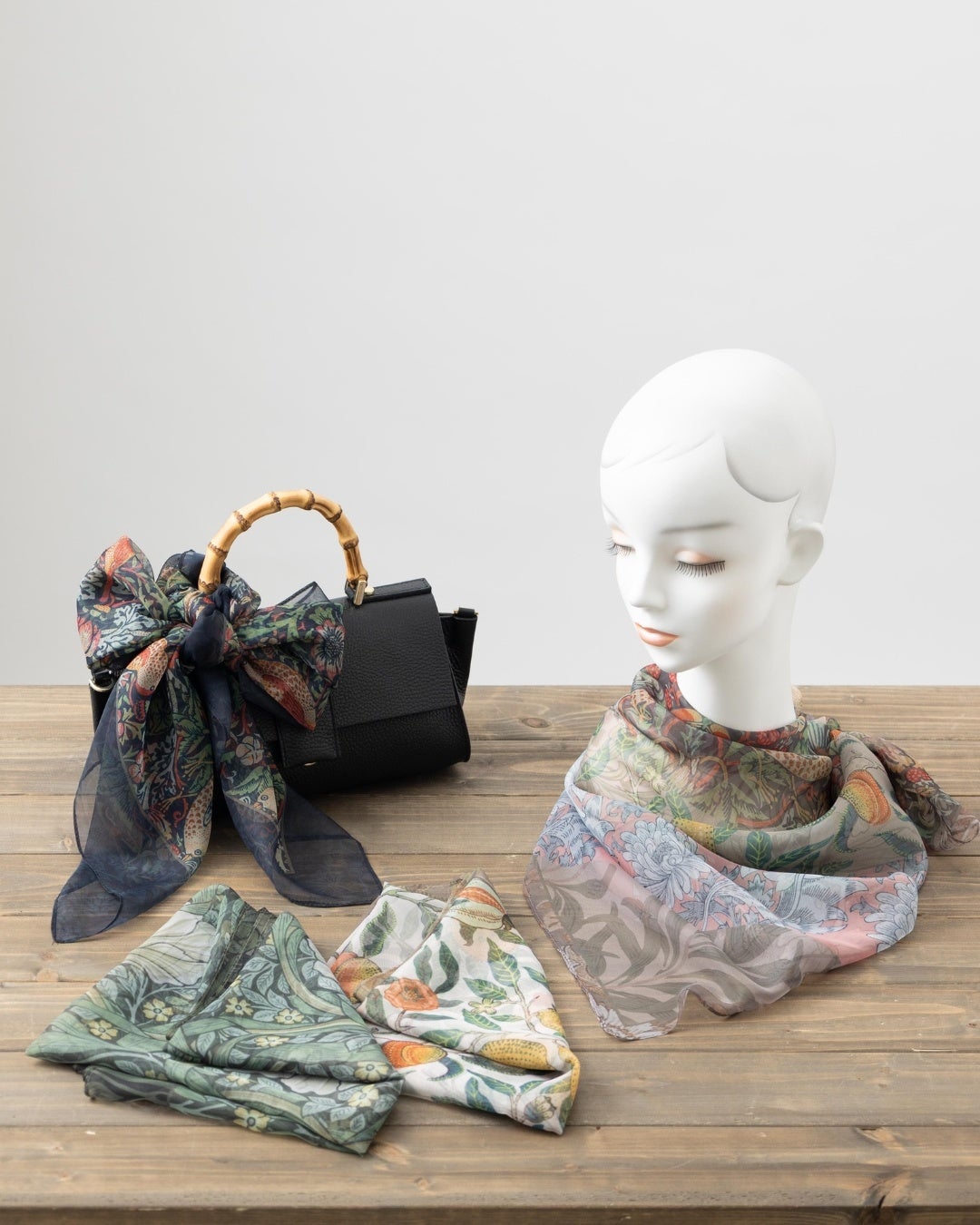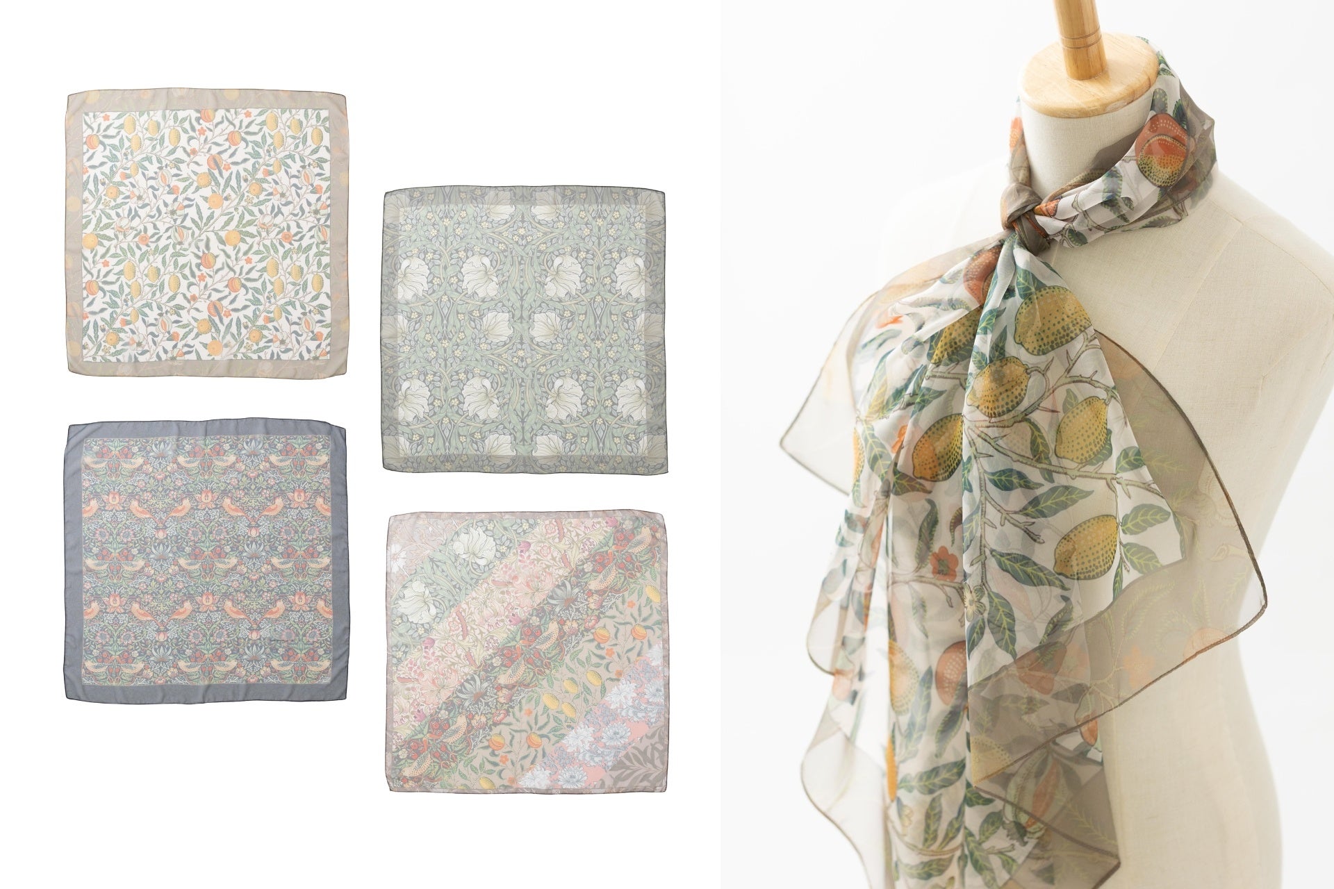 軽やかなシフォン素材で仕立てた、ウィリアム・モリス柄のシフォンスカーフが新発売。