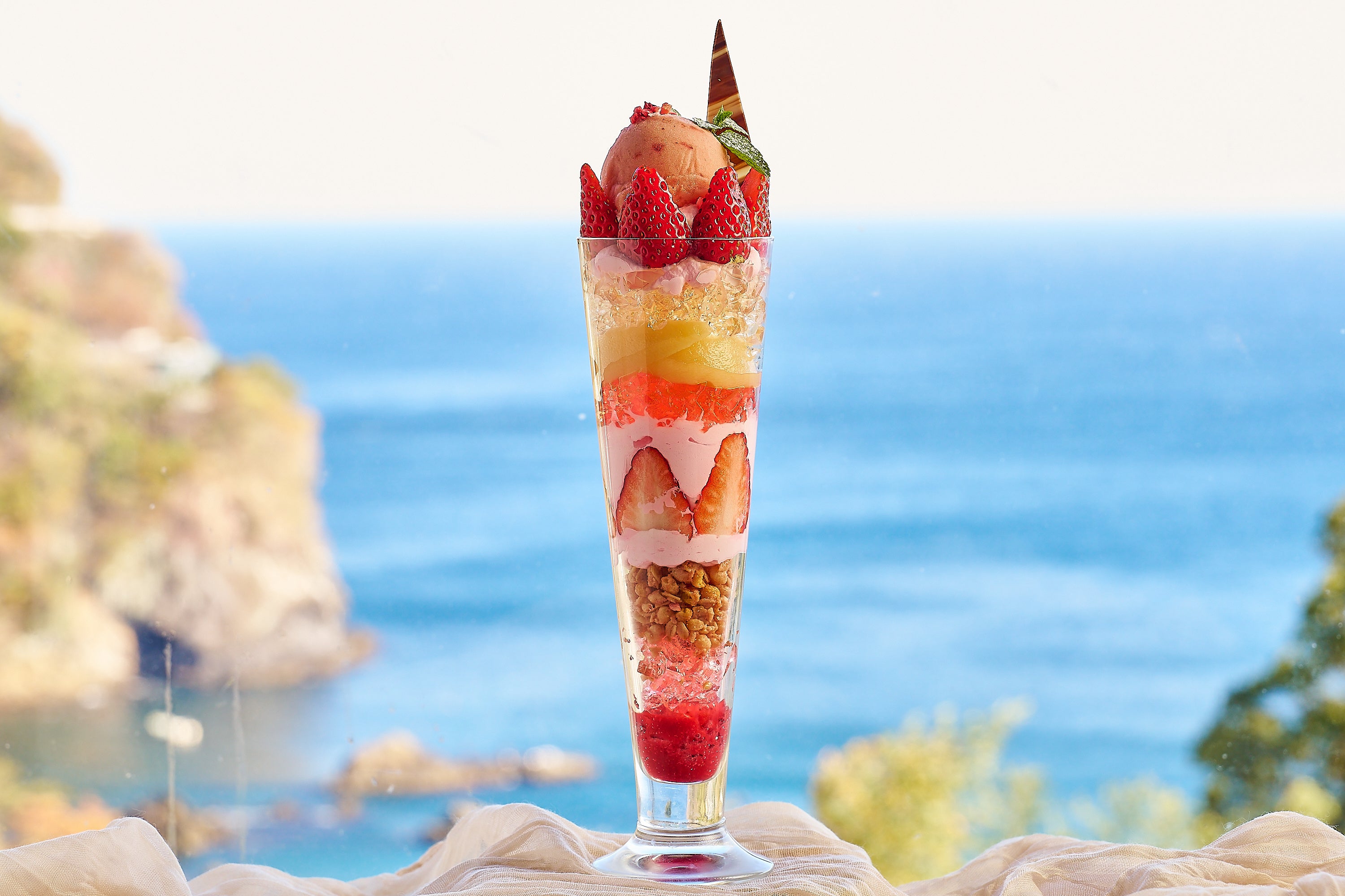 詳細: 旬の苺とピスタチオをあしらった、期間限定のクラシックパフェ。