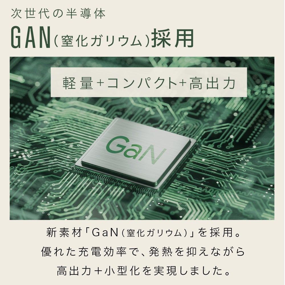 優れた充電効率をもつGaN(窒化ガリウム)を採用することにより、最大65Wの高出力ながらサイズは小型化を実現しました。