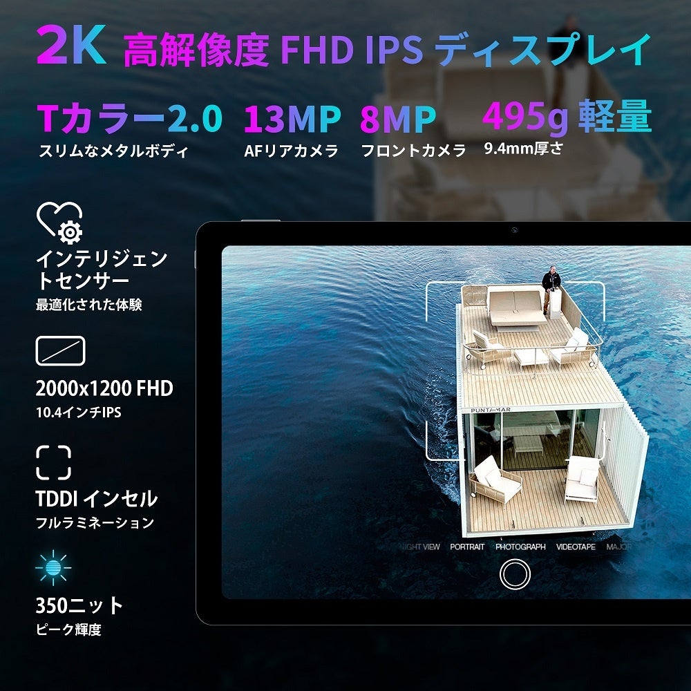 10.4インチ2kベゼルレスディスプレイを使用して、映画館のような魔法を提供可能です。BOEとTDDIテクノロジーが利用されたディスプレイは、タッチセンサーをLCDの既存の構造に統合し、反射を減らし、タッチ応答性を向上させます。また、T-Color 2.0カラー最適化アルゴリズムにより、より鮮やかでリアルな色が表示されます。