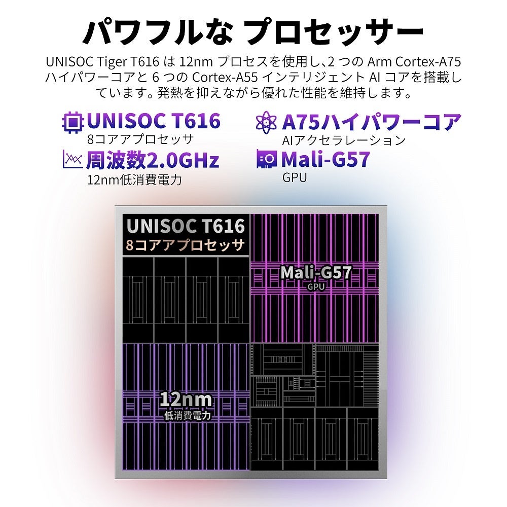 Teclast T40Proは、UNISOC Tiger T616プロセッサを利用するために、2.0GHzの周波数と12nm低消費電力を備え、2つのArm Cortex-A75ハイパワーコアと6つのCortex-A55インテリジェントAIコアを搭載しています。 発熱を抑えながら優れた性能を維持できます。
