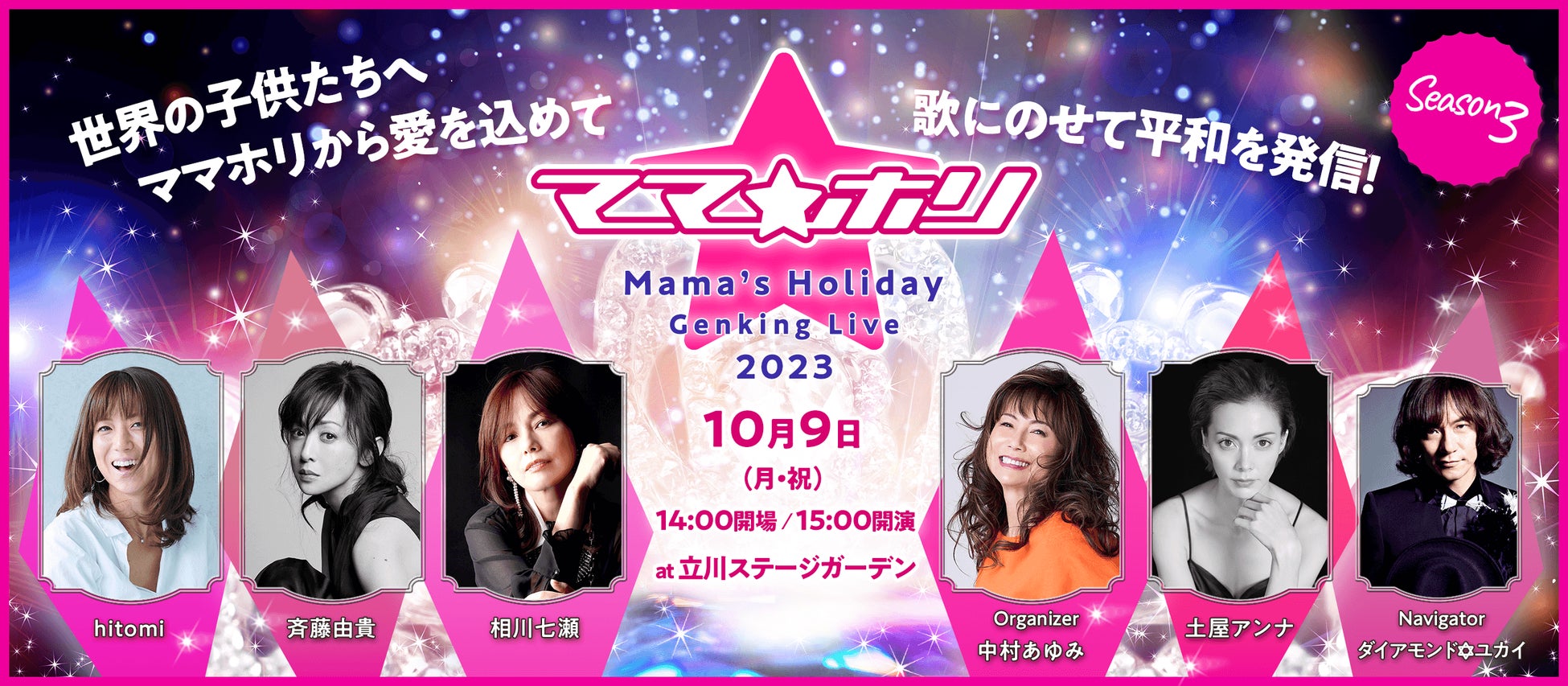 10月9日開催の『ママホリ2023 ~Genking Live~』に中村あゆみ、斉藤由貴、相川七瀬、hitomi、土屋アンナ、ダイアモンド☆ユカイの出演が決定!