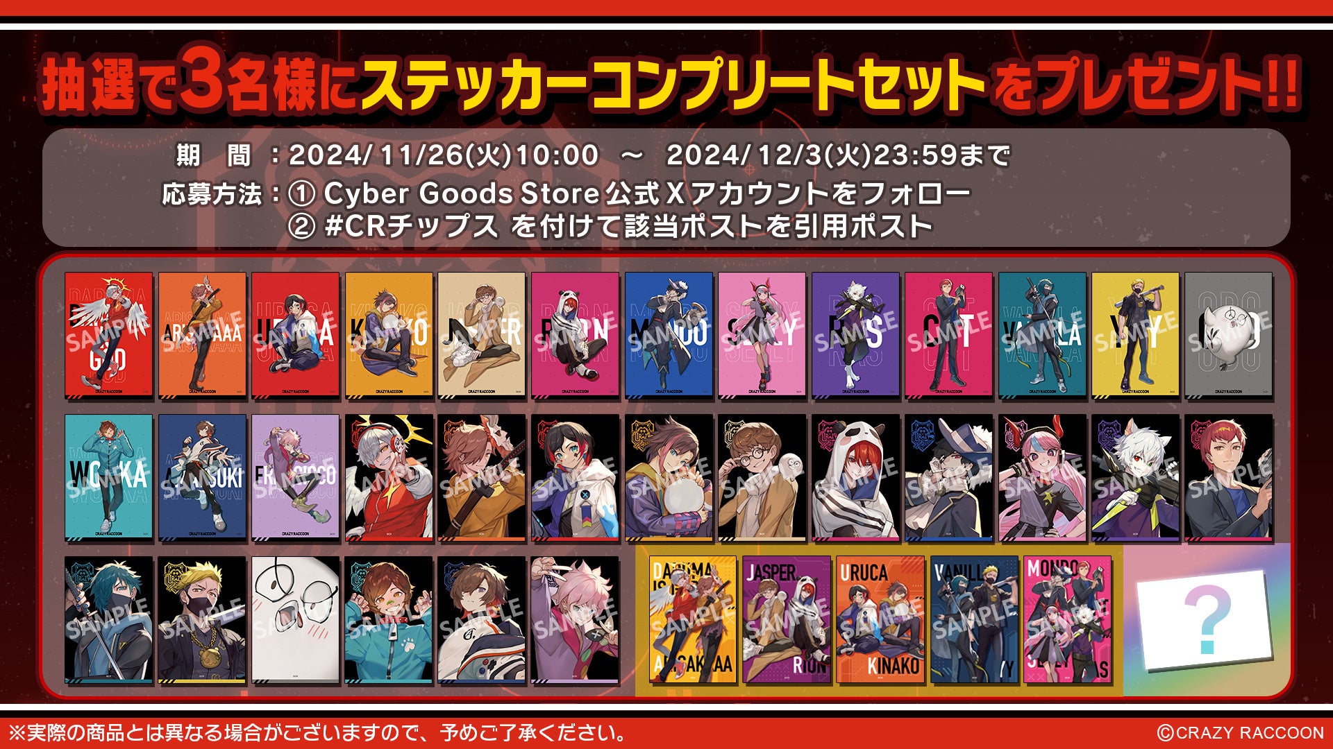 株式会社サイバーエージェント(本社:東京都渋谷区、代表取締役:藤田晋、東証プライム市場:証券コード4751)は、プロゲーミングチーム「Crazy Raccoon」とコラボした『Crazy Raccoon チップス』を、全国のファミリーマートとCyber Goods Store にて、2024年11月26日(火)より販売いたします。本商品には、イラストレーター「lack」による描き起こしイラストを使用したオリジナルステッカー1枚がおまけとして付いてきます。また、販売開始を記念して、抽選で3名様にステッカーコンプリートセットが当たるプレゼントキャンペーンを実施いたします。