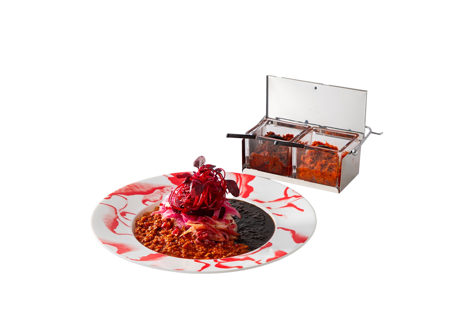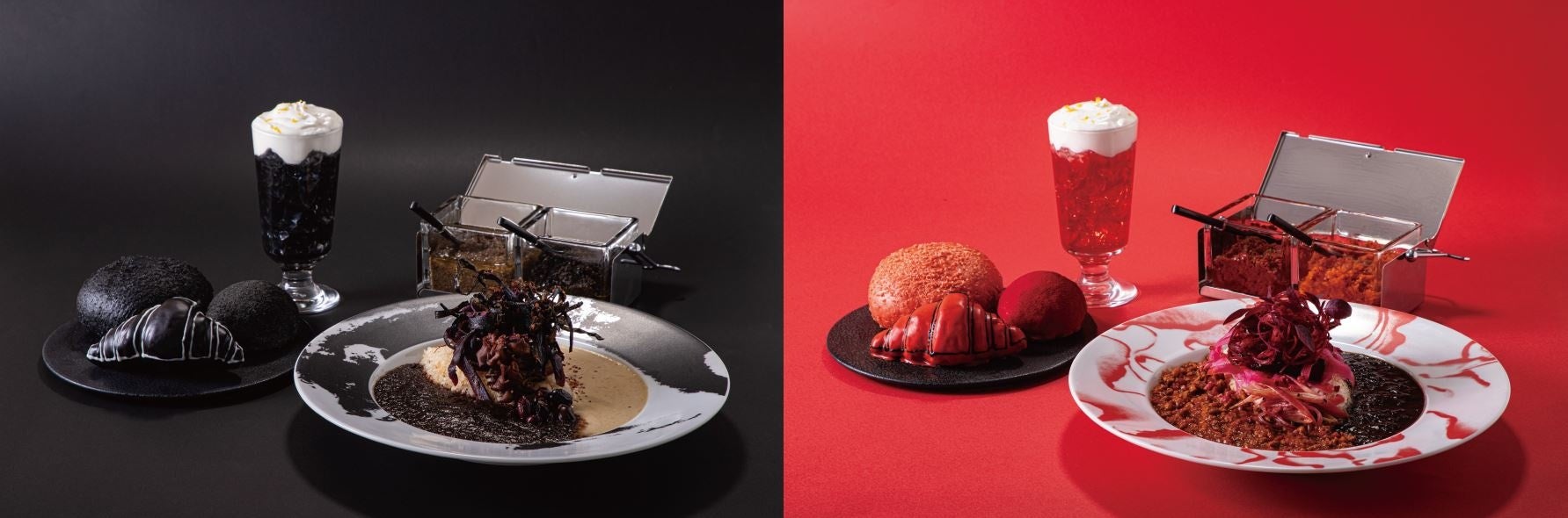メニューは、「森山大道・蜷川実花2人の写真家の世界観をカレーを通じて表現する」をコンセプトにした「黒と白」のカレー、「赤と黒」のカレーをメインに、黒と赤のシュークリーム、カレーパン、クロワッサン、レモネードなど、見た目からは想像できないような繊細な味が楽しめる独自の工夫を凝らしたラインナップをご用意いたしました。