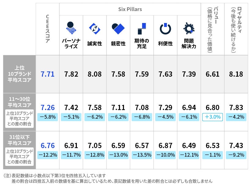 本レポートは、KPMGが14年間にわたりブランド調査を実施するなかで定義した優れた顧客体験を構成する「パーソナライズ」「親密性」「利便性」「誠実性」「期待の充足」「問題解決力」からなる「Six Pillars(6つの要素)」や、「バリュー(価格に見合った価値)」「推奨度」「ロイヤルティ(今後も使い続けるか)」「各タッチポイントチャネルの満足度」などについて評価を行い、「CEEスコア」として集計しています。