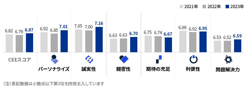 【日本の調査分析対象ブランドにおけるCEEスコアおよびSix Pillarsスコアの平均推移(2021~2023年)】