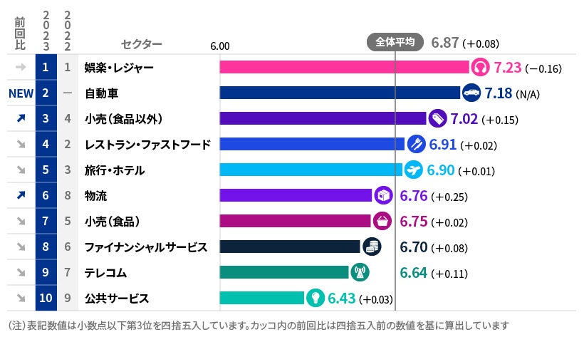今回の調査では、「娯楽・レジャー業界」が前年に引き続き最も高い顧客体験評価を獲得しました。2番目には今年新たに調査対象に追加した「自動車業界」が、3番目が前回から1つ順位を上げた「小売(食品以外)」となりました。調査対象に自動車業界が加わったことで多くのセクターが順位を下げるなか、「物流業界」は前回から順位を上げています。