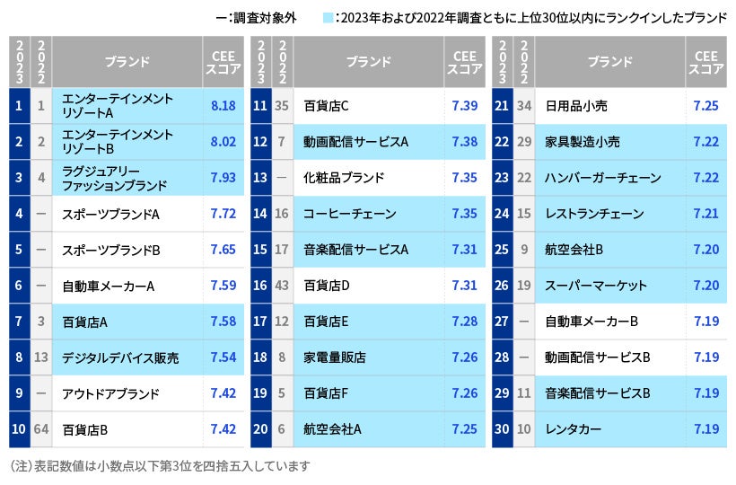 【日本の調査分析対象におけるCEEスコア上位30ブランド(2023年)】