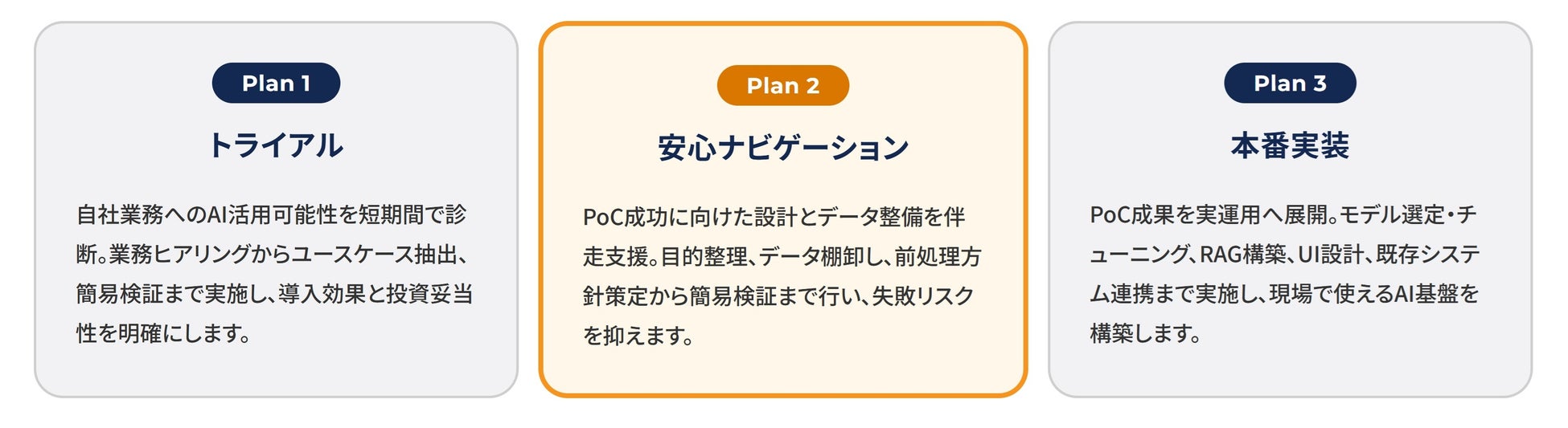 本サービスでは、目的と規模に応じて選択できる3つの導入プランを用意しています。「スモールスタートから全社展開へ」をコンセプトに、トライアル(最小構成)、安心ナビゲーション(実用化検証)、本番実装(全社展開)という段階に応じてお選びいただけます。初期投資を最小化しながら、将来の拡張性を確保し、部門展開・複数拠点展開へとスケール可能なAI基盤を構築します。