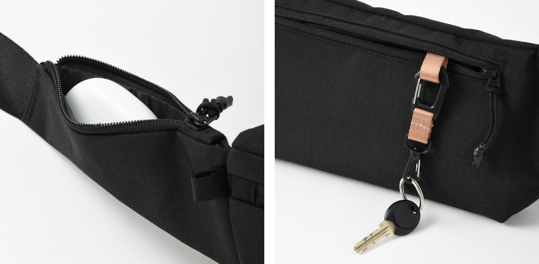 内装には小物を入れられるポケットが2つ(うち1つは着脱式ポーチ)、背面にパスポートが入るポケット、サイドにイヤフォンを収納できるポケットを配置。 背面ポケットにはキーストラップが装備されています。