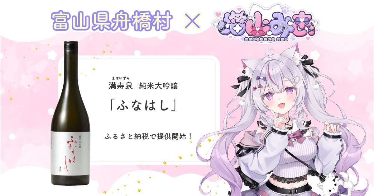 日本酒が大好きなVtuber「猫山みあ」と老舗の酒蔵である満寿泉がコラボをして富山県舟橋村のふるさと納税の返礼品として日本酒「ふなはし」を8月11日(月)9時より提供します。返礼品は株式会社あるやうむ(本社:北海道札幌市、代表取締役:畠中博晶、以下「あるやうむ」)が提供する寄付サイトにて寄付を受け付けます。このふるさと納税ではファン(寄付者)からVtuberに返礼品を送って応援がすることができます。
