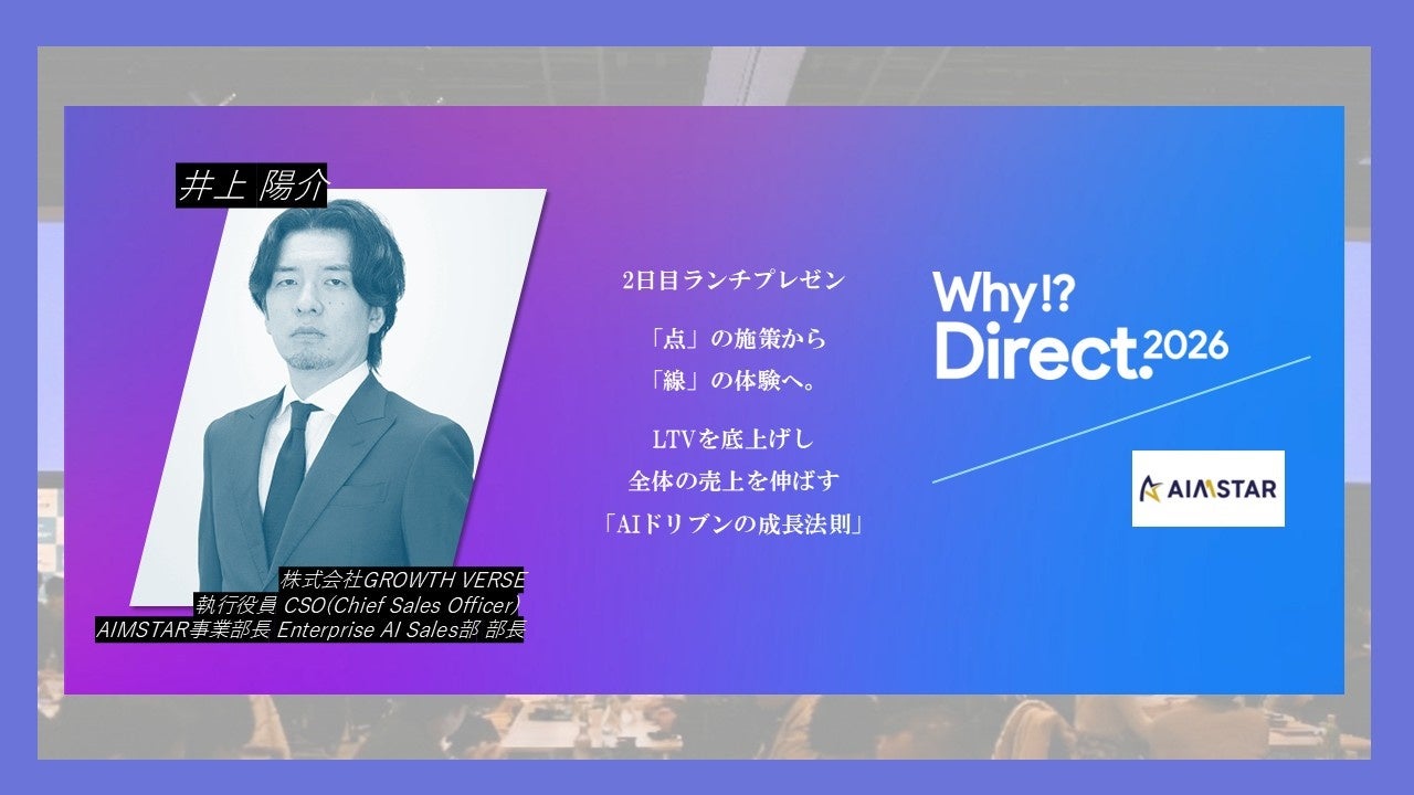 株式会社GROWTH VERSE(本社:東京都港区、代表取締役会長 兼 CTO 南野 充則、代表取締役社長 兼 CEO 渡部 知博)は、2026年2月18日~20日に福岡で開催される日本最大級のD2C,EC合宿型カンファレンス「Why!? Direct. 2026」にランチスポンサーとして参加することをお知らせいたします。