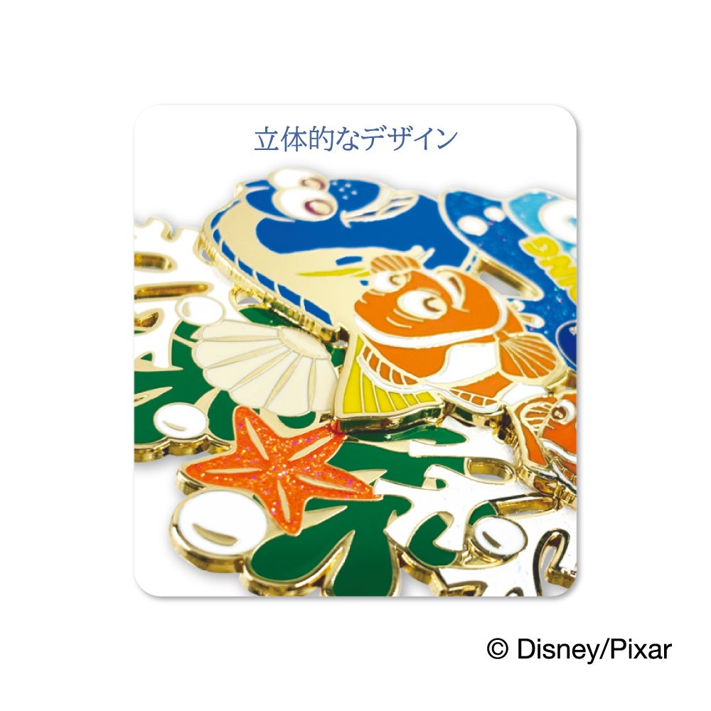 『ファインディング・ニモ』に登場するニモ、マーリン、ドリーの立体的なメタルパーツと一緒に海のモチーフがデザインされています。