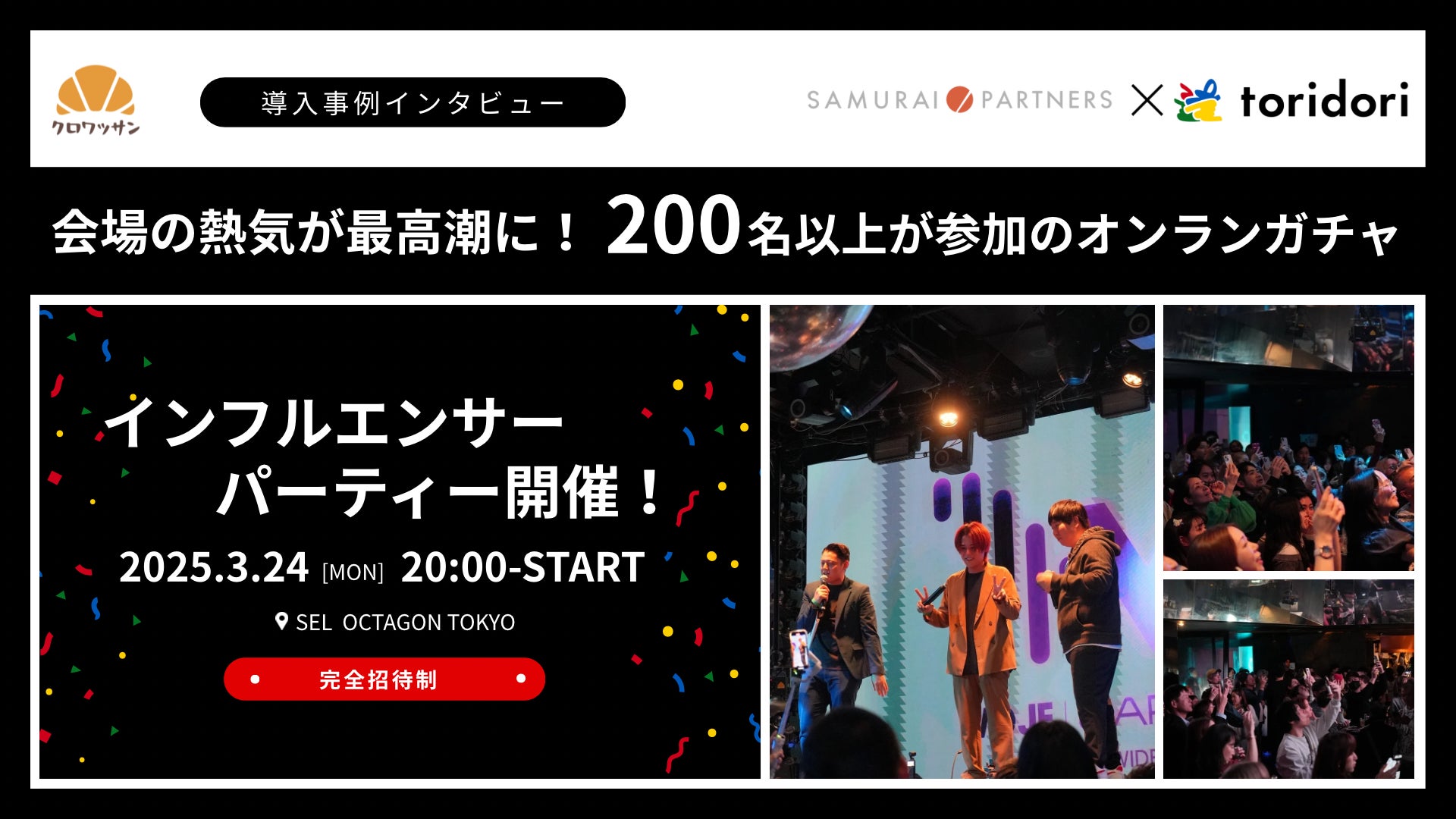 今回のイベントは、TikTokやInstagram、YouTubeなどで活躍するインフルエンサー約250名が参加した、完全招待制のインフルエンサーパーティでした。主催は株式会社サムライパートナーズと株式会社トリドリの2社共同で、インフルエンサー同士の交流や、スポンサー企業との接点づくりを目的に企画されました。このパーティは単なる交流の場ではなく、“盛り上がりのある体験”を提供できる場にしたいという狙いがありました。