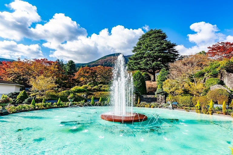 箱根登山電車の終着駅、強羅に大正3年(1914年)に開園された、日本初のフランス式整型庭園です。フランス式整型庭園とは、平坦で広大な敷地に左右対称で幾何学的に噴水池などを配置した特徴がありますが、強羅公園は傾斜面に作られています。当時の強羅エリアの開発にあわせて計画され、別荘の居住者や開園5年後に開通した「箱根登山鉄道」の多くの利用者で親しまれてきました。 現在も昔と変わらない広い空と山々に囲まれた開放的な公園は、2004年に体験工房「箱根クラフトハウス」、後にサンドイッチ料理レストラン「一色堂茶廊」がオープンし、1日を通して様々な体験を楽しめるのが魅力です。