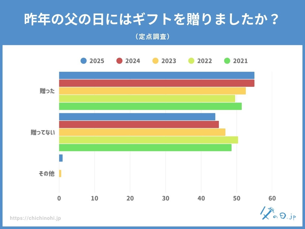 父の日.jpが2025年に実施したアンケート調査によると、「昨年の父の日にギフトを贈った」と回答した人は55.2%にのぼり、3年連続で半数を上回る結果となりました。一方、「贈っていない」と回答した人も44.1%と依然として高く、父の日がすべての家庭で習慣化されているわけではない現状が浮かび上がりました。