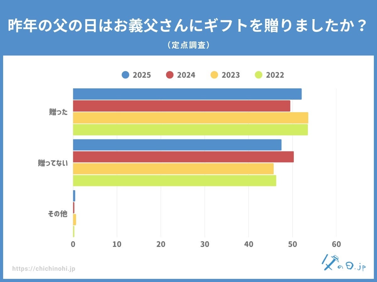 一方で、「贈っていない」と回答した人も47.5%とほぼ同数で存在しており、義父との関係性や距離感、家庭内の習慣などによって対応が分かれる側面もあります。とはいえ、実父とほぼ同等のギフト率となった今回の結果は、父の日がより多様なかたちで家族の絆を深める機会となっている証と言えるでしょう。