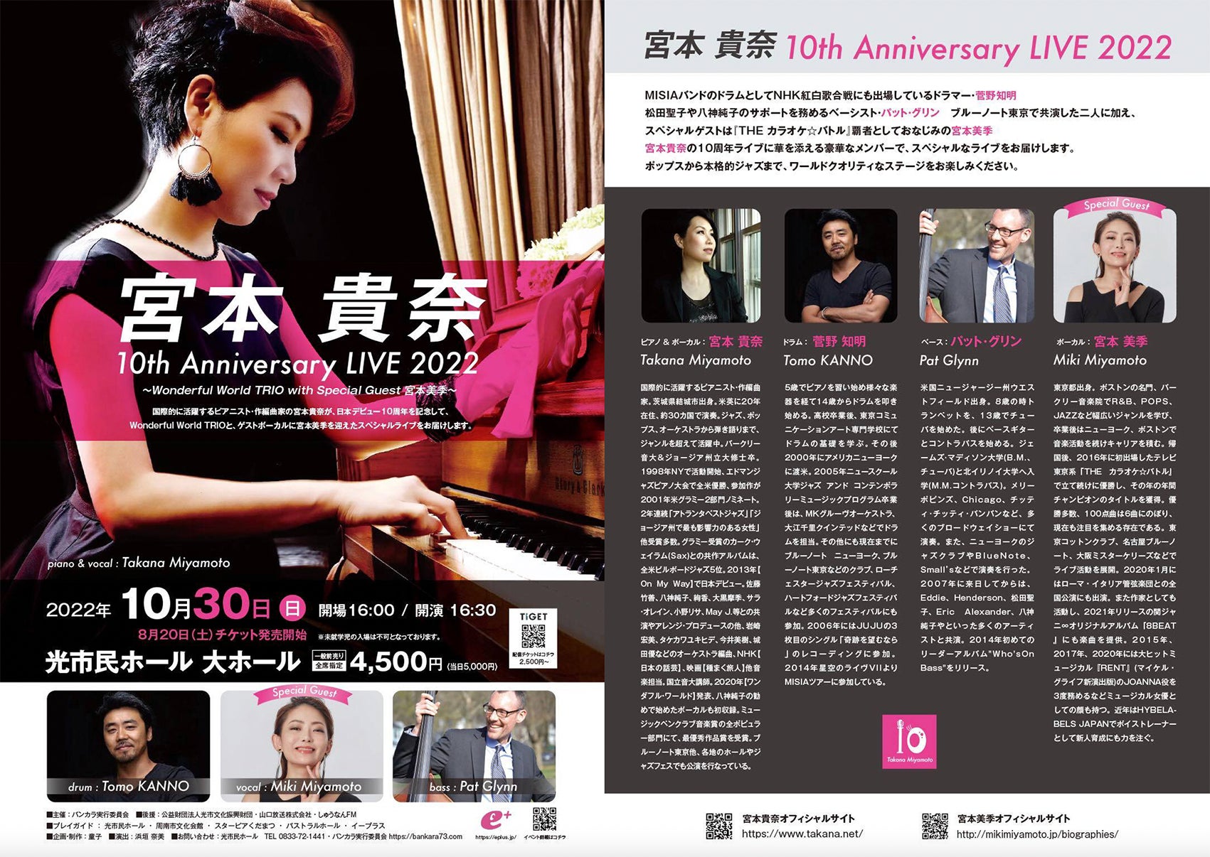 【コラボキャンペーン 3組無料招待】宮本貴奈 10th Anniversary LIVE 2022~ Wonderful World TRIO 10/30 山口県光市民ホール