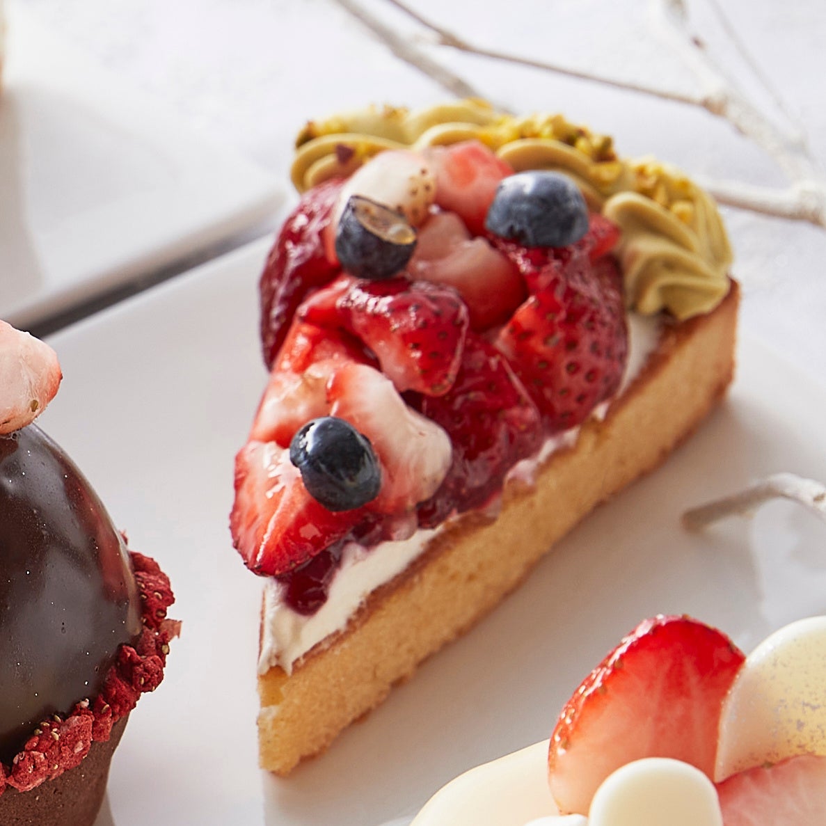 アーモンドクリームを使ったしっとりとしたタルト生地の土台に、数種類のベリーのコンポートとチーズクリーム、ピスタチオクリームを盛りつけました。甘酸っぱい果実たちとなめらかな2種のクリームが織りなす味わいをお楽しみください。
