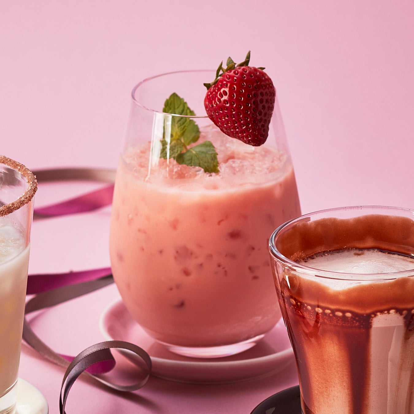 クッキー&チョコレートの甘い香りを纏わせた、香り華やかなストロベリー風味の甘酢っぱいカクテル。ミルキーピンクの色合いに苺を飾りつけた可愛いルックスはバレンタインにぴったりです。
